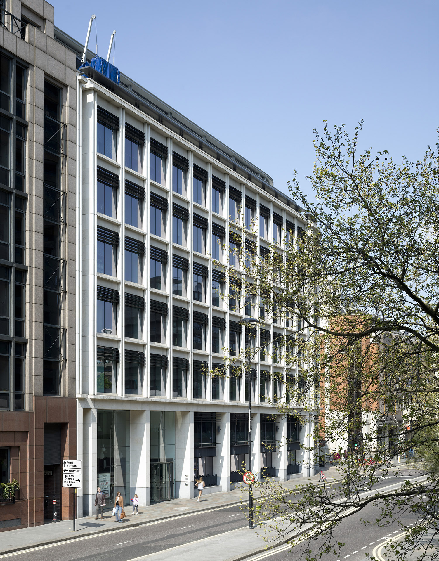 The principal frontages combine large full height windows set within deeply recessed limestone mullions, terminating in a semi-circular northerly form. At the lower levels the office floors expand to the full width of the site in a terracotta-clad form responding to the adjoining buildings of the Conservation Area.